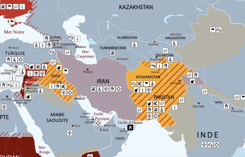 💡 La Carte mondiale des risques 2026 montre que l’Iran se situe à l’intersection de plusieurs théâtres :